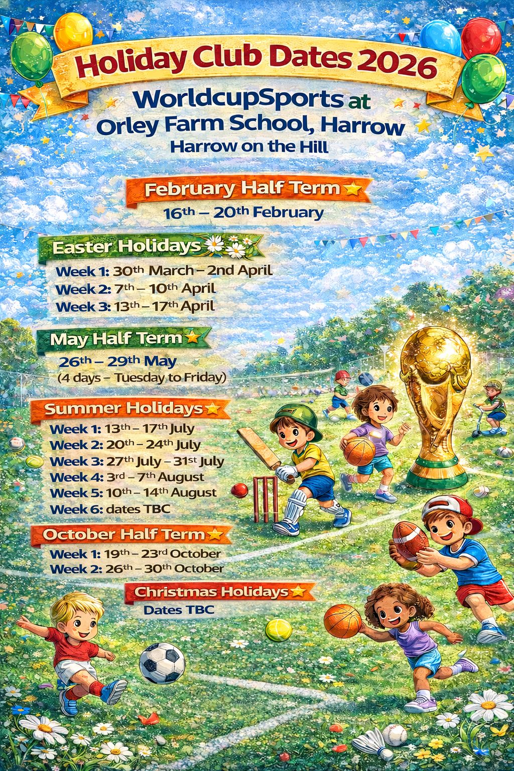 Worldcupsports childcare provider sports/activities at 4 schools during holidays (+ Saturdays in term time)